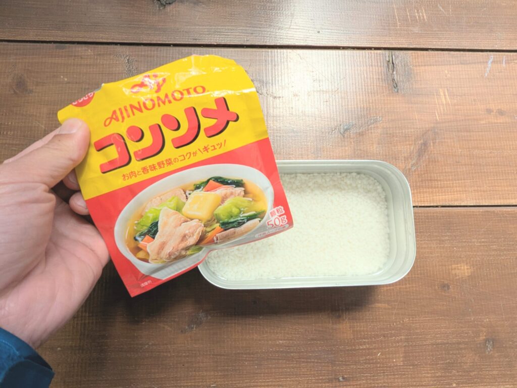 メスティンに米1合と水を入れ、コンソメを大さじ1杯分入れます。