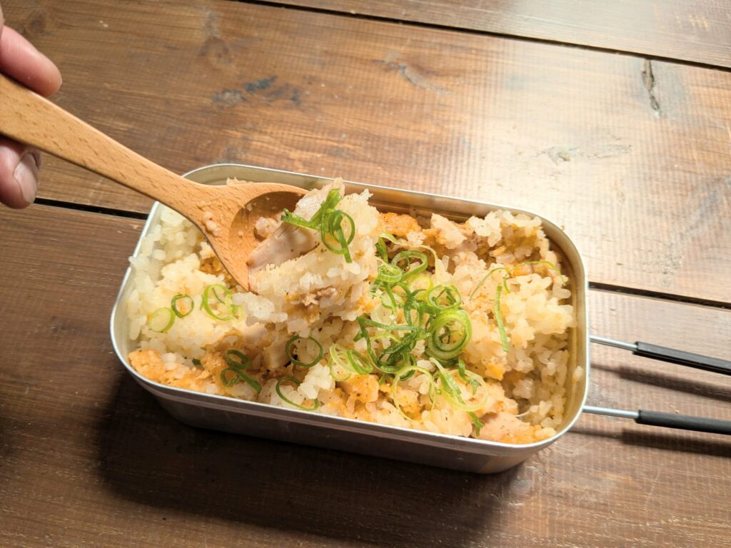 使用するのはメスティン。炊飯、煮る、蒸す、揚げるなど、1台で何でもできる優れものです。